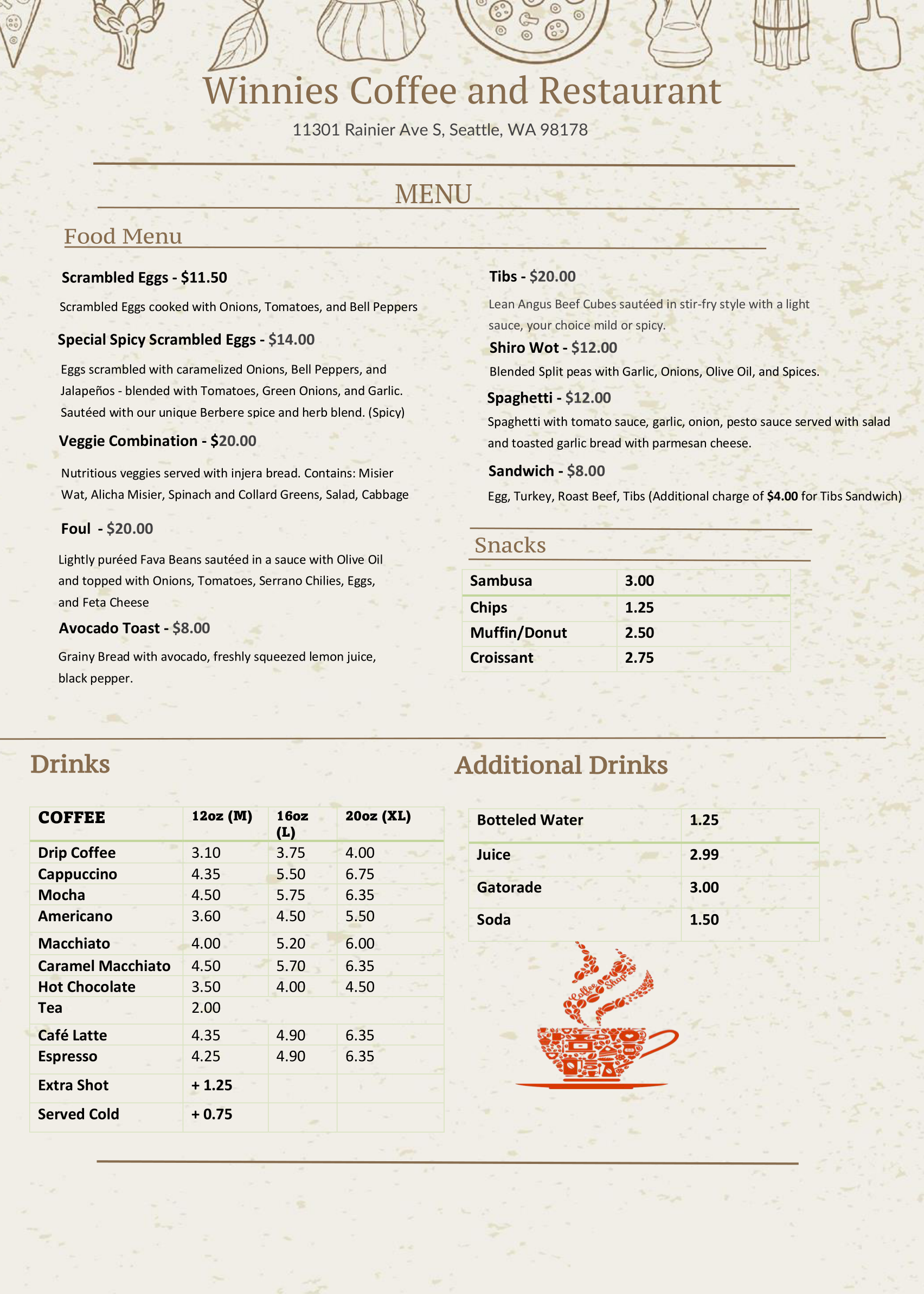 At Winnie's Coffee and Restaurant, we bring an authentic Ethiopian gastronomic experience to your table. Our high-quality coffee, varied menu, and vibrant atmosphere offer an unforgettable culinary adventure.